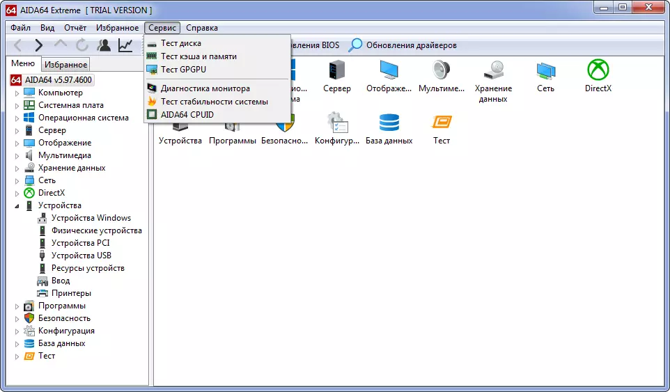 Также доступен ряд стресс-тестов в меню «Сервис»:
