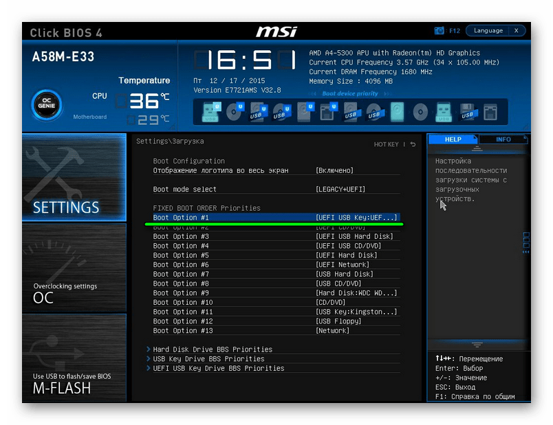 Эта продвинутая версия БИОСа имеет графический интерфейс и работать в ней можно с помощью мышки. Чтобы выставить там загрузку со съемного носителя, выполните ряд простых действий, а конкретно: