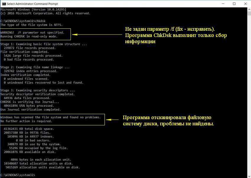 Если в командной строке ввести команду chkdsk, то в итоге проверки Вы получите только отображение о состоянии диска, информацию о файловой системе, но не исправите найденные ошибки.
