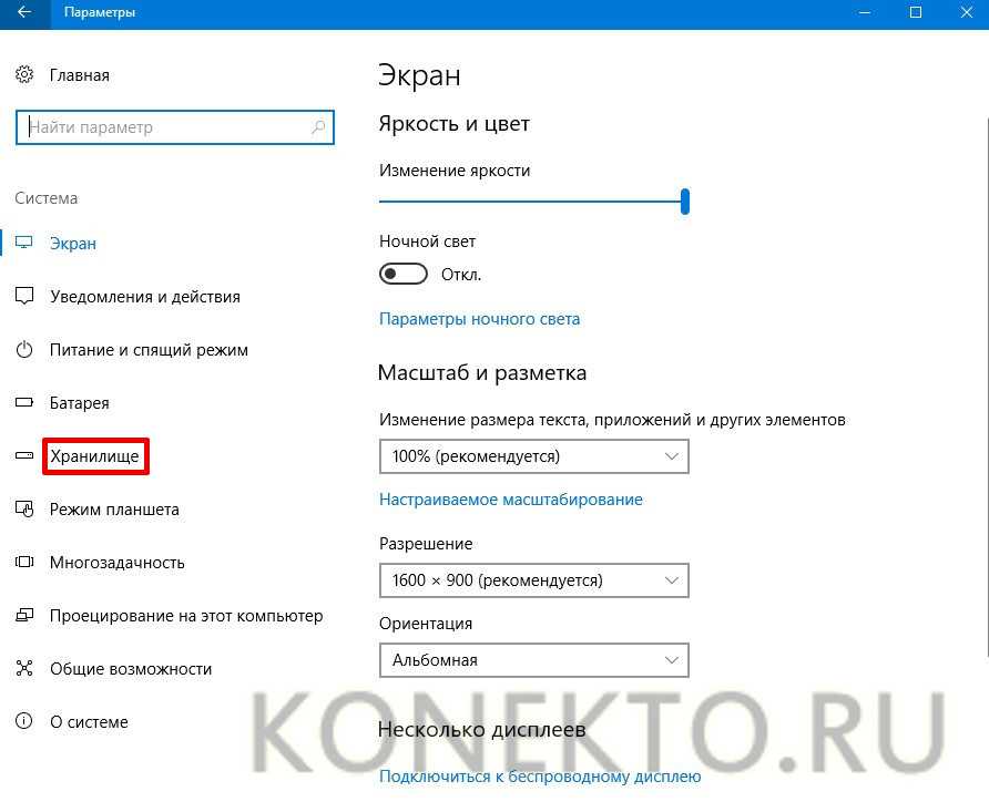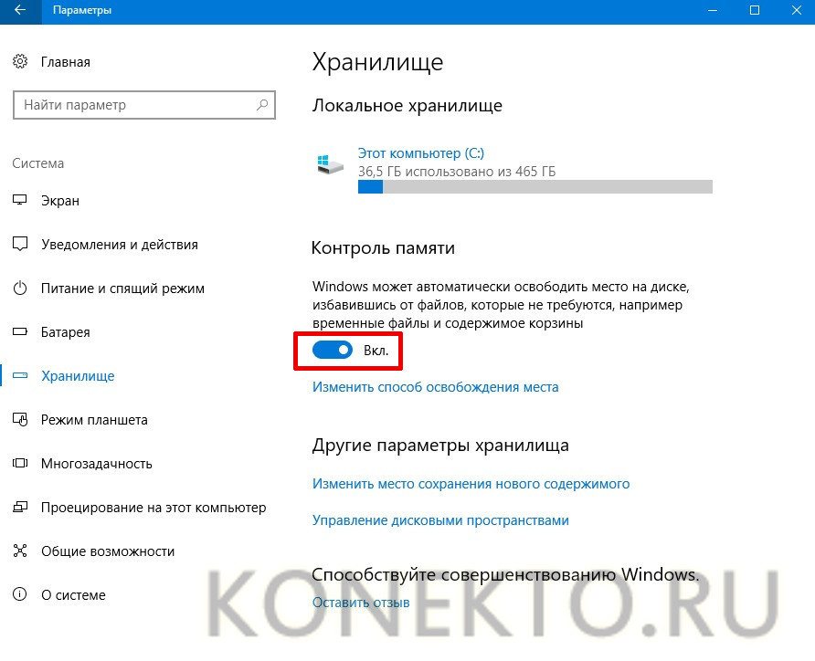 Если винчестер переполнен, следует удалить ненужные программы или файлы. Можно также воспользоваться пунктом «Контроль памяти», чтобы автоматически освободить место от временных файлов и содержимого корзины. Для этого нужно перевести переключатель в положение «Включено».