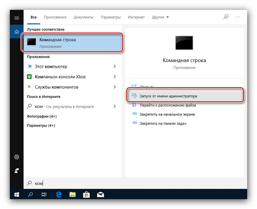 - Откройте «Поиск», в котором начните вводить слово . После обнаружения результата выделите его, затем обратитесь к меню справа и воспользуйтесь пунктом «Запуск от имени администратора».