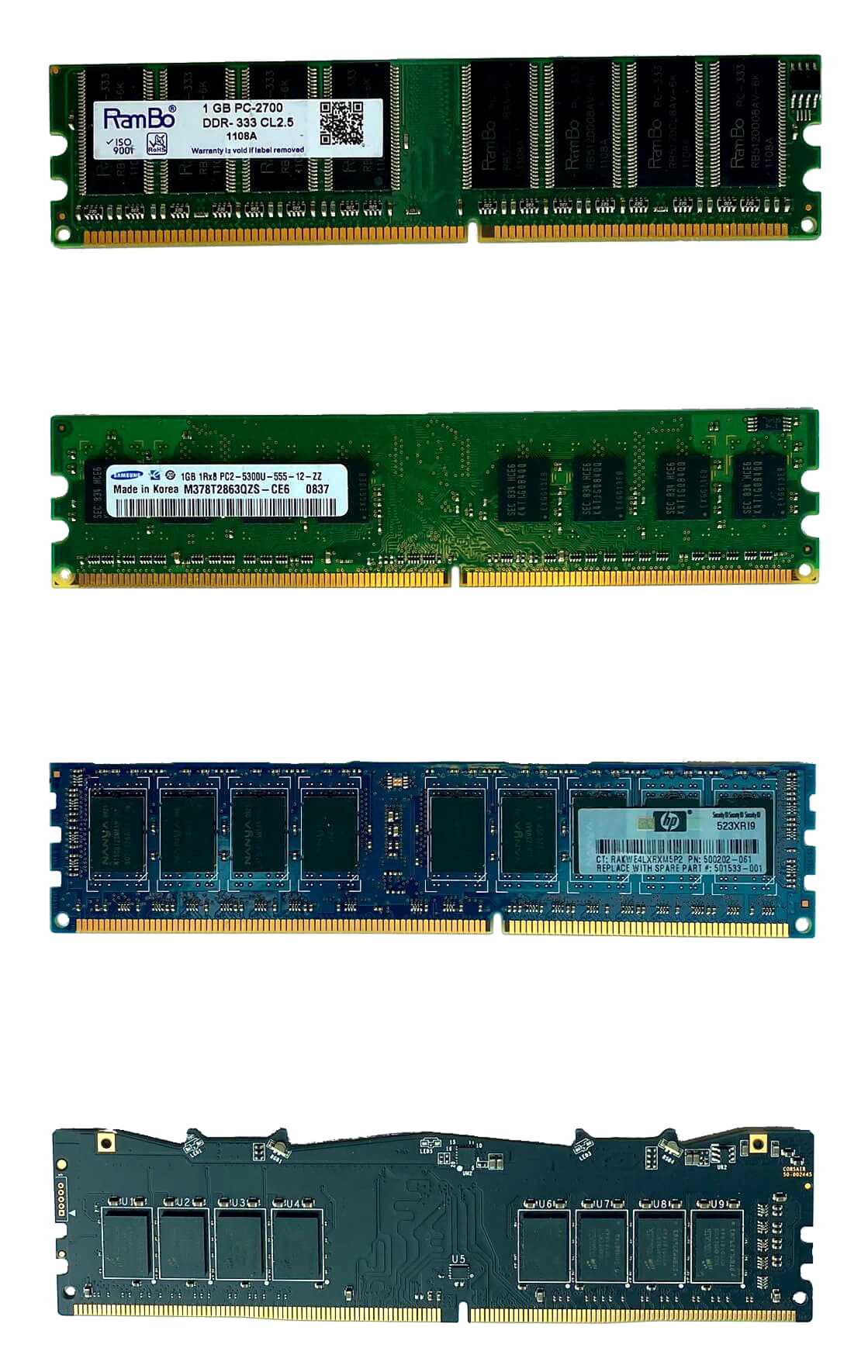 Сверху вниз: DDR-SDRAM, DDR2, DDR3, DDR4