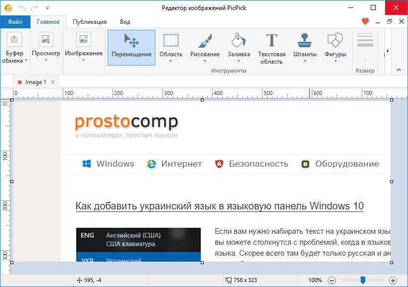 После создания снимка экрана в программе PicPick, он откроется в редакторе.