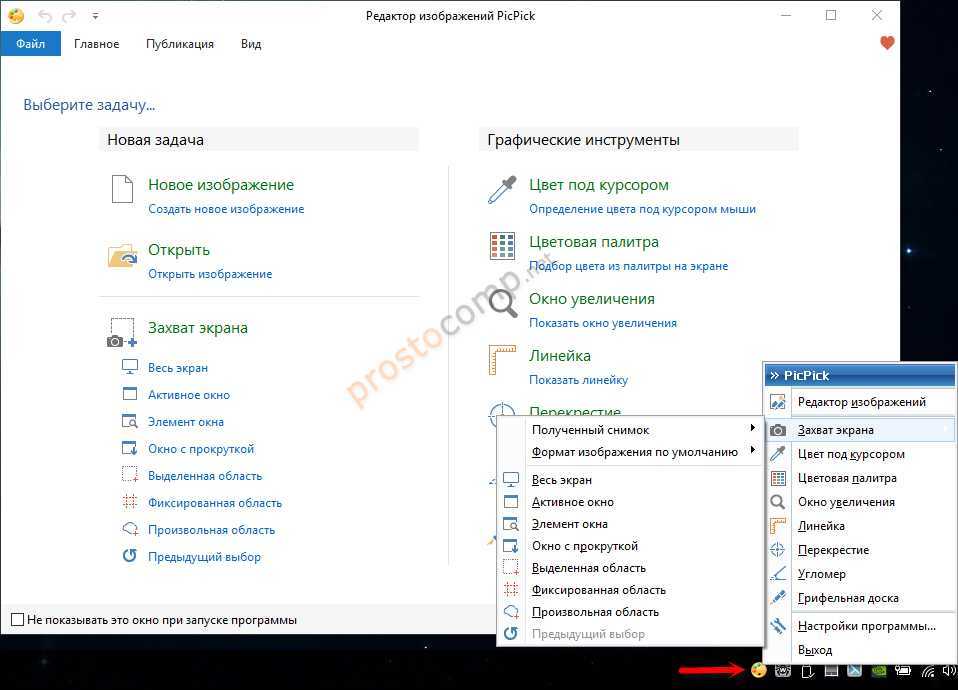 После установки, на панели уведомлений появится иконка программы PicPick. Чтобы открыть основное окно программы, нажмите на не два раза. Или нажмите правой кнопкой мыши. Можно выбрать один из вариантов для создания скриншота, или открыть редактор. Кроме этих функций, там еще есть линейка, цветовая палитра, окно увеличения и т. д.