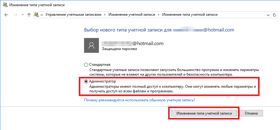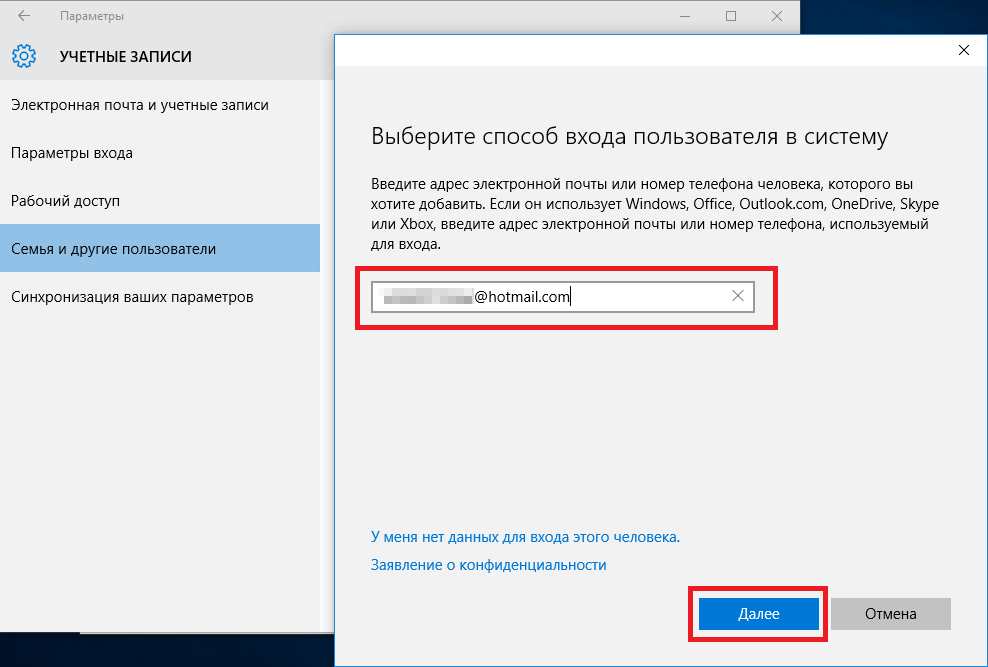 В мастере введите почту своего аккаунта Outlook и нажмите кнопку Далее. На этих действиях работа мастера завершится, и онлайн аккаунт будет добавлен в качестве новой учетки. Теперь перейдем к нашей он-лайновой учетной записи и сменим ее тип, как в предыдущем примере на администратора.