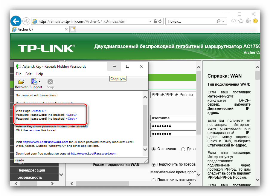 Единственный метод извлечения пароля от проводного соединения заключается в использовании веб-интерфейса роутера и утилиты Asterisks Key, предназначенной для просмотра символов, скрытых в полях ввода.