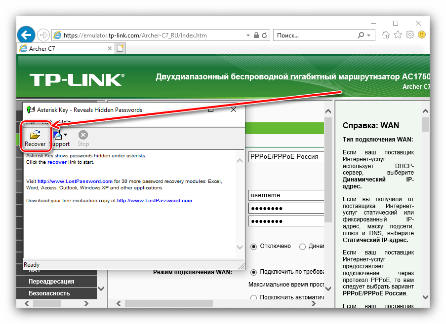 Откройте Asterisks Key, поместите окно приложения рядом с браузером и перейдите к нему. Далее выделите нужное поле, переключитесь на утилиту и нажмите в ней «Recover».