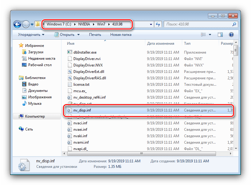 - Откройте «Проводник» и перейдите по адресу C:NVIDIAWin7*номер версии драйверов* , где найдите и откройте файл nv_disp.inf.