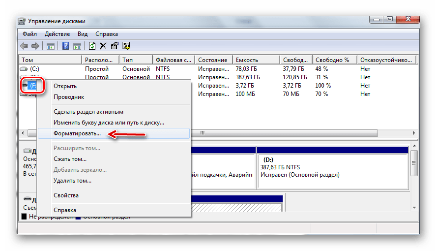 В появившемся окне вы увидите перечень всех дисков. Напротив каждого из них – данные о состоянии, типе файловой системы и объёме памяти. Нажмите правой кнопкой по обозначению проблемной флешки и выберите «Форматировать».