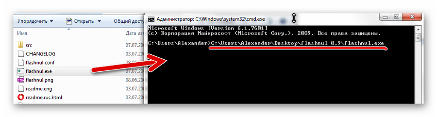 В распакованных файлах скачанной ранее программы найдите «flashnul.exe» и перетащите в консоль, чтобы там корректно отобразился путь к программе.