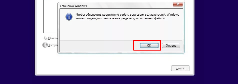 В нашем случае диск еще не размечен, поэтому система оповестит еще и о создании дополнительных загрузочных разделов: