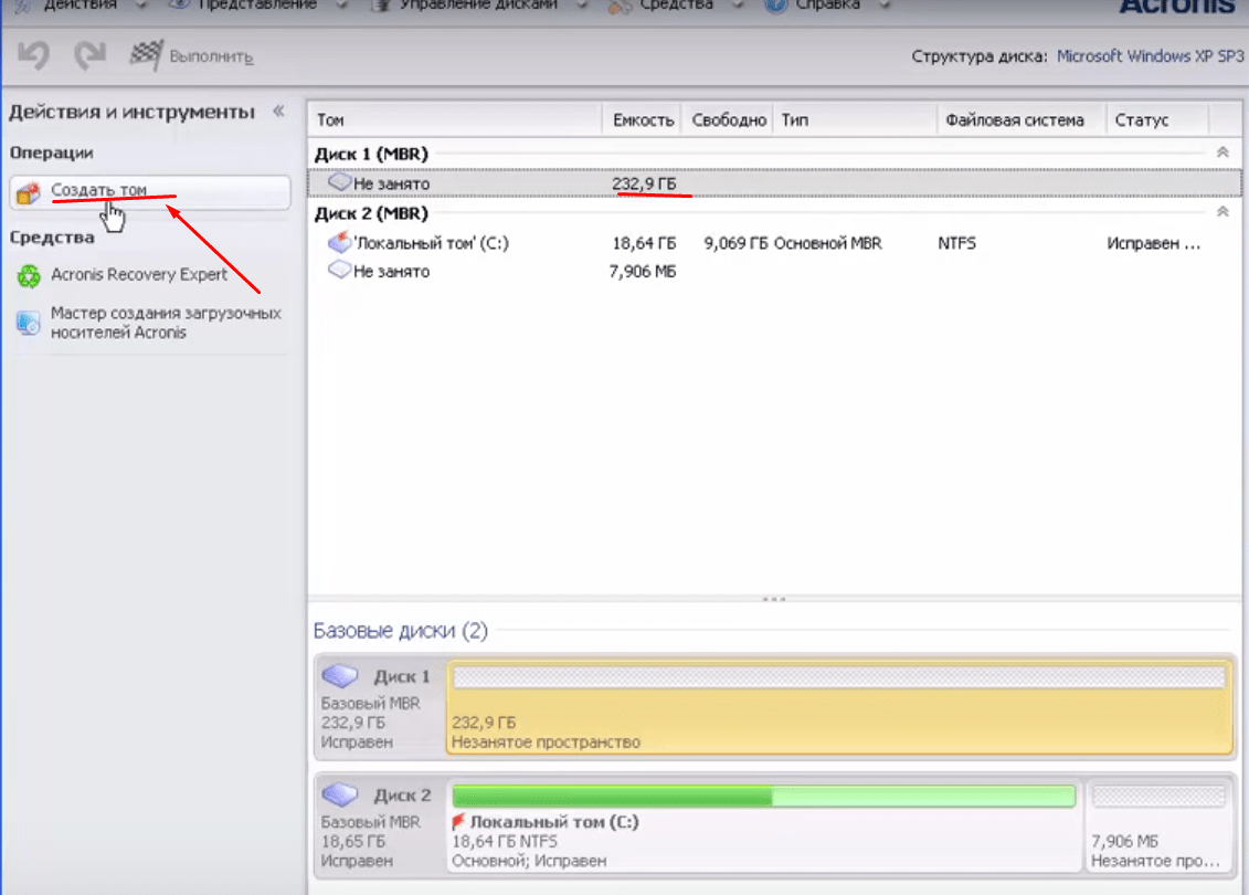 Acronis позволяет изменять размеры существующих томов без потери данных за счет свободного места соседних разделов. Будьте внимательны! Если у Вас диск до отказа заполнен данными, то создать том на нем том получиться только после того, как вы удалите с него часть данных, то есть появится свободное место.