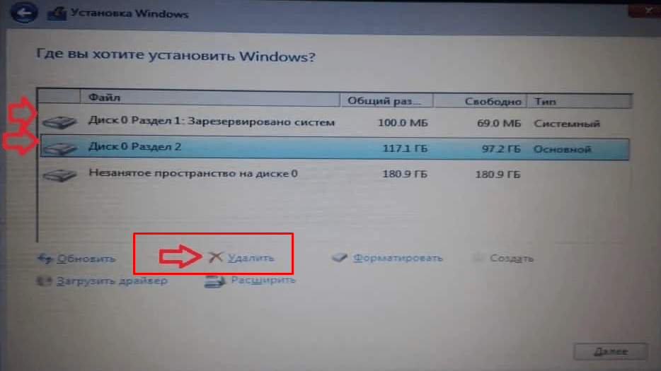 - Остаётся выбрать раздел, на который будет установлена система Windows и нажать «Далее»;