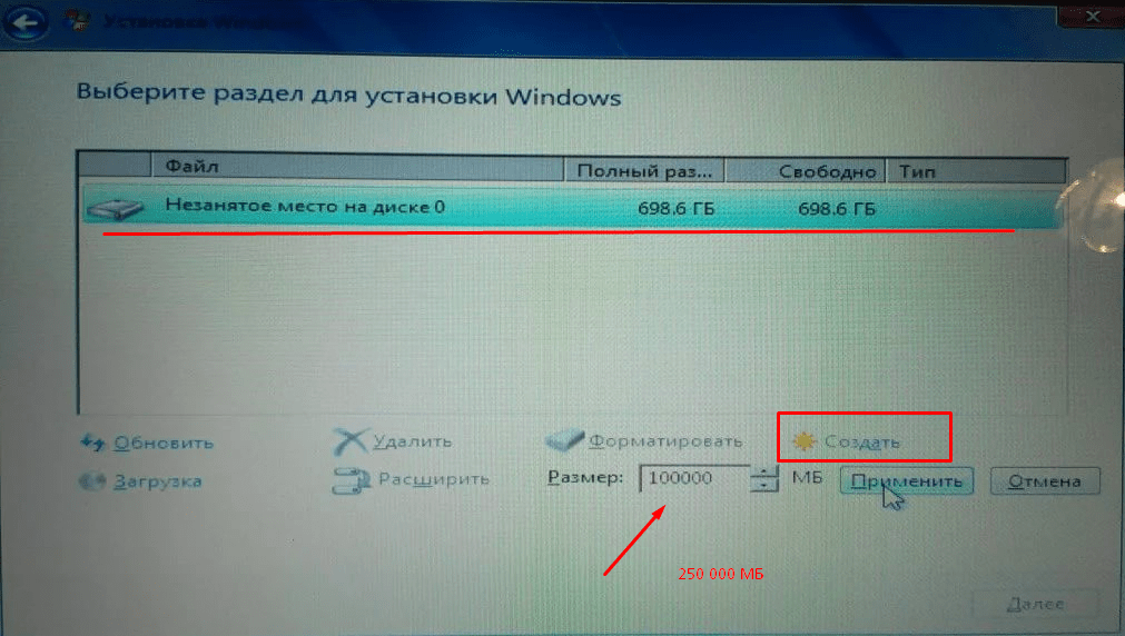 Итак, когда мы решаем, где устанавливать Windows, мы должны сначала создать раздел (системный) к примеру размером 250 Гб: