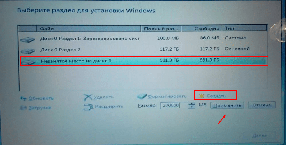 - Создаём системный раздел на компьютере, для этого выберите «Создать»;