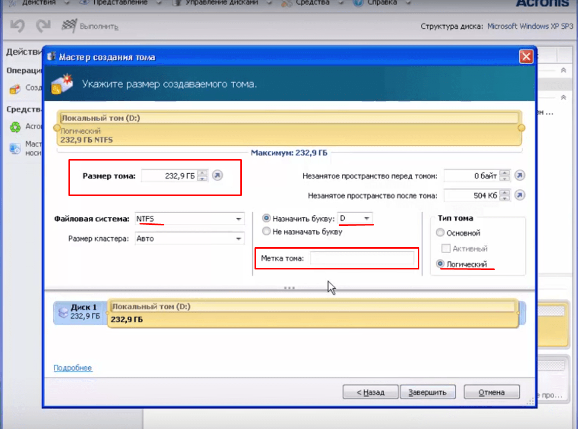 Далее вам необходимо следовать советам и инструкции из мастера создания тома, который в Acronis Disk Director во многом похож на стандартного мастера Windows. Если у вас нет специальных пожеланий, достаточно кликать постоянно на кнопку «Далее».