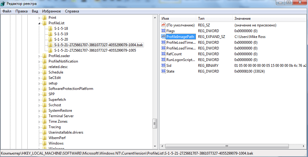 Раскрываем ProfileList и находим подпапку со значением «C:UsersMike Ross» в параметре ProfileImagePath.