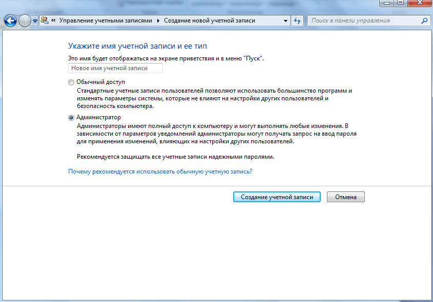 Обратите внимание: чтобы изменить название папки администратора, необходимо создать другого с правами администратора. Для этого перейдите в «Панель управления» — «Управление учетными записями» — «Добавление и удаление учетных записей» — «Создание новой учетной записи» (результат отображен на рисунке внизу)