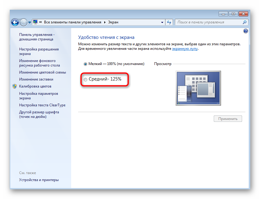 К сожалению, возможности сделать масштаб еще больше нет, поскольку разработчики добавили соответствующую опцию только в более новых версиях ОС. Вместо этого в Windows 7 предлагается задействовать лупу, чтобы с помощью нее приближать определенные элементы. Активируется она в том же разделе Панели управления, о котором шла речь только что. Там же находится и более детальное описание данной функции.