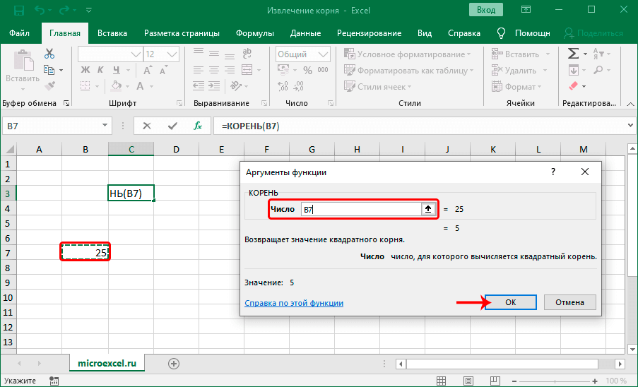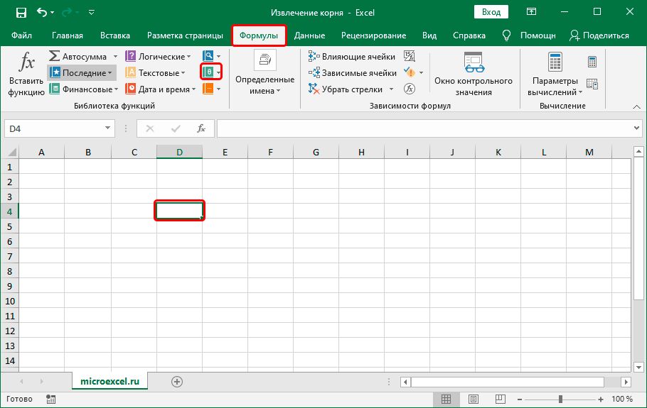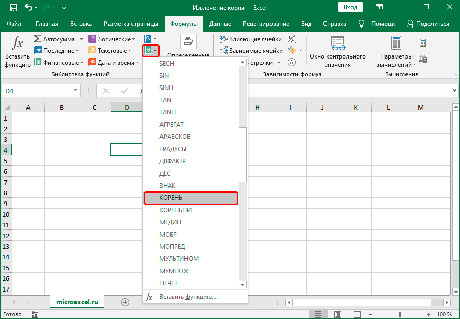 Воспользоваться формулой для извлечения корня можно через окно вставки функций. Вот, как это делается: