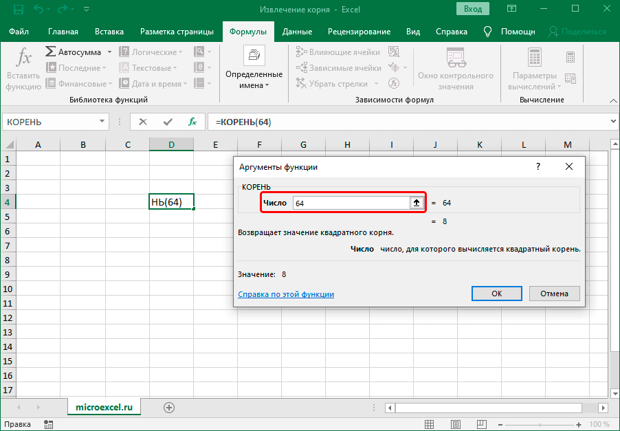 Для выполнения расчета достаточно написать данную формулу в любой свободной ячейке (или в строке формул, предварительно выбрав нужную ячейку). Слово “число”, соответственно, меняем на числовое значение, корень которого нужно найти.