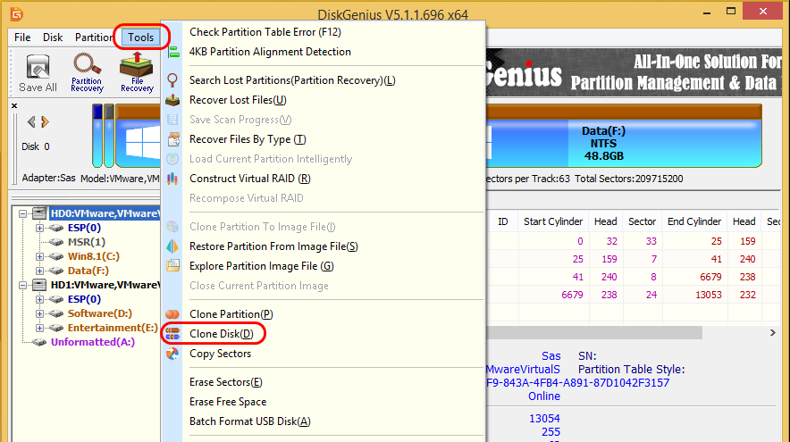 Для запуска операции клонирования в меню «Tools» выбираем «Clone Disk».