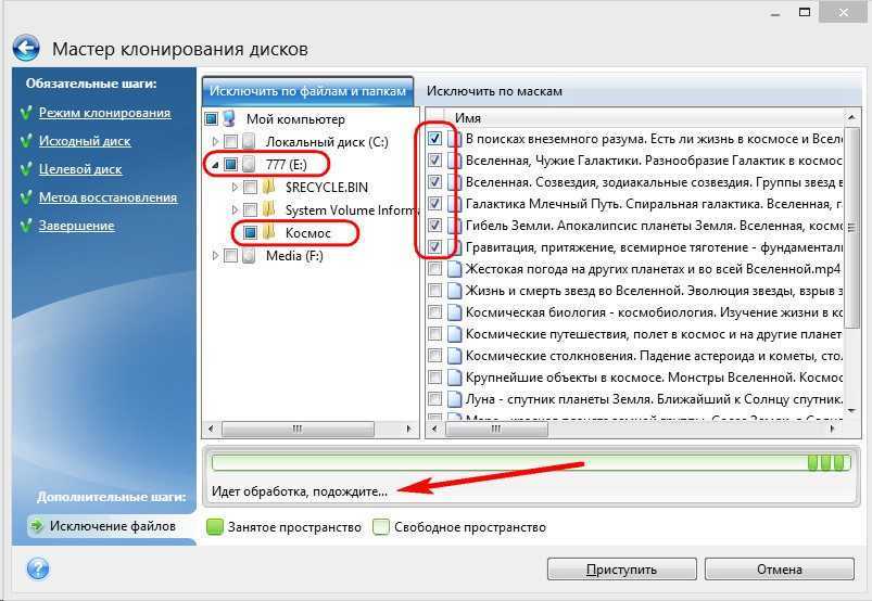 Шаг 10. Раздел F исходного диска мы исключаем в полном объеме установкой возле его наименования галочки и все включенные файлы и папки выделяются после этого автоматически. После окончания операции клонирования данный раздел будет создан на целевом диске, но не будет содержать каких-либо данных. Когда все разделы и файлы, которые нам не потребуются на целевом диске, будут исключены из клонирования, можем запустить весь процесс нажатием на кнопку «Приступить».