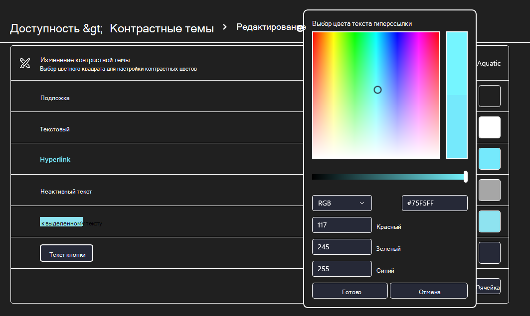 Выбрав тему, выберите кнопку Изменить в меню Контрастность тем. Вы можете изменить цвет следующих элементов экрана.