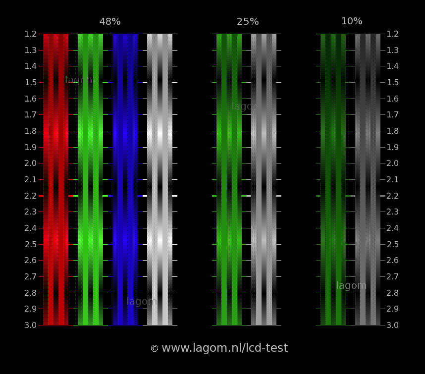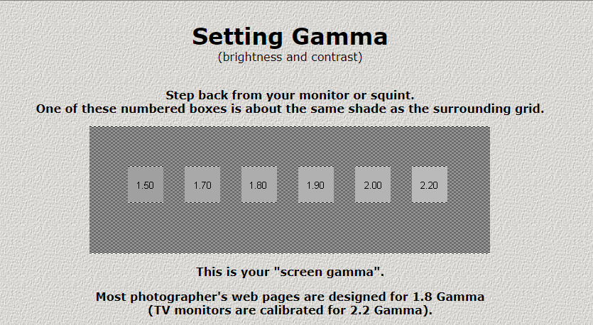 Другим инструментом является цветовой тест экрана W4zt. Это быстрее, чем Lagom, поэтому, если вам нужно настроить параметры на лету, это хороший выбор. Просто отрегулируйте ползунки гаммы, яркости и контрастности вашего монитора, пока квадрат 2,2 не станет примерно того же оттенка, что и окружающая сетка.