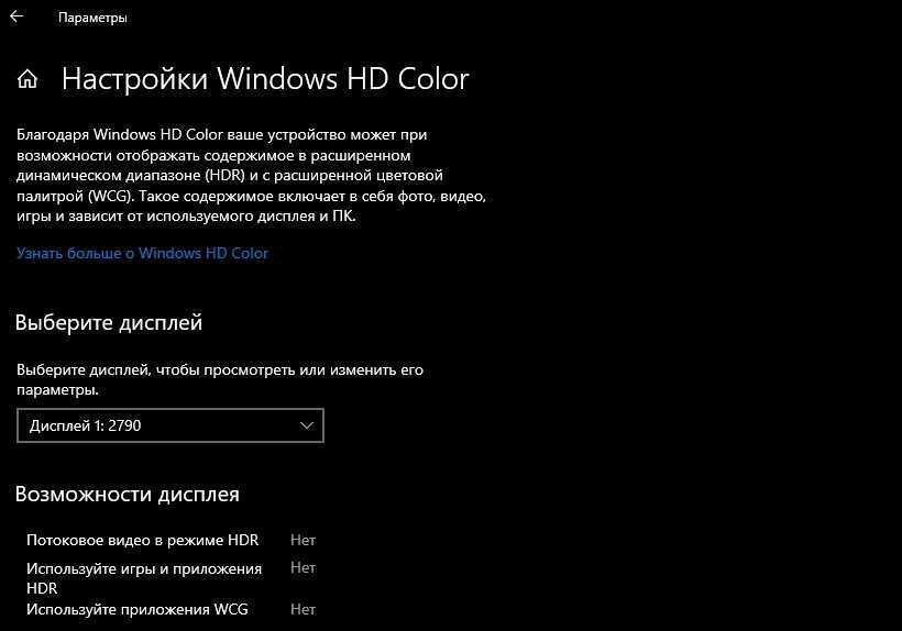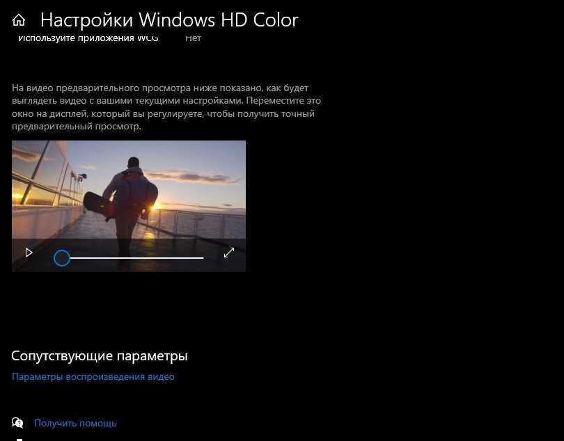 Подпункт «Windows HD Color» настраивается в том случае, если монитор поддерживает определенные функции (HDR и WCG). Как поменяется вид экрана, можно увидеть с помощью небольшого видео предварительного просмотра, размещенного на консоли.