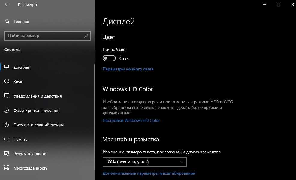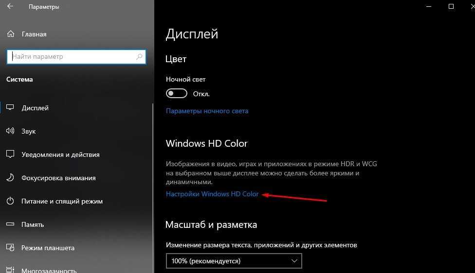 откроется окно и список («Выбрать (конкретный) дисплей», «Яркость и цвет», «Windows HD Color», «Масштаб и разметка» и другие);