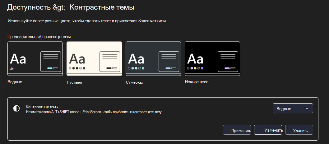 Чтобы включить контрастные темы, выберите нужные темы в меню Контрастность тем, а затем выберите кнопку Применить. Windows в течение нескольких секунд может отображаться экран «Пожалуйста, подождите», после чего изменятся цвета на экране.