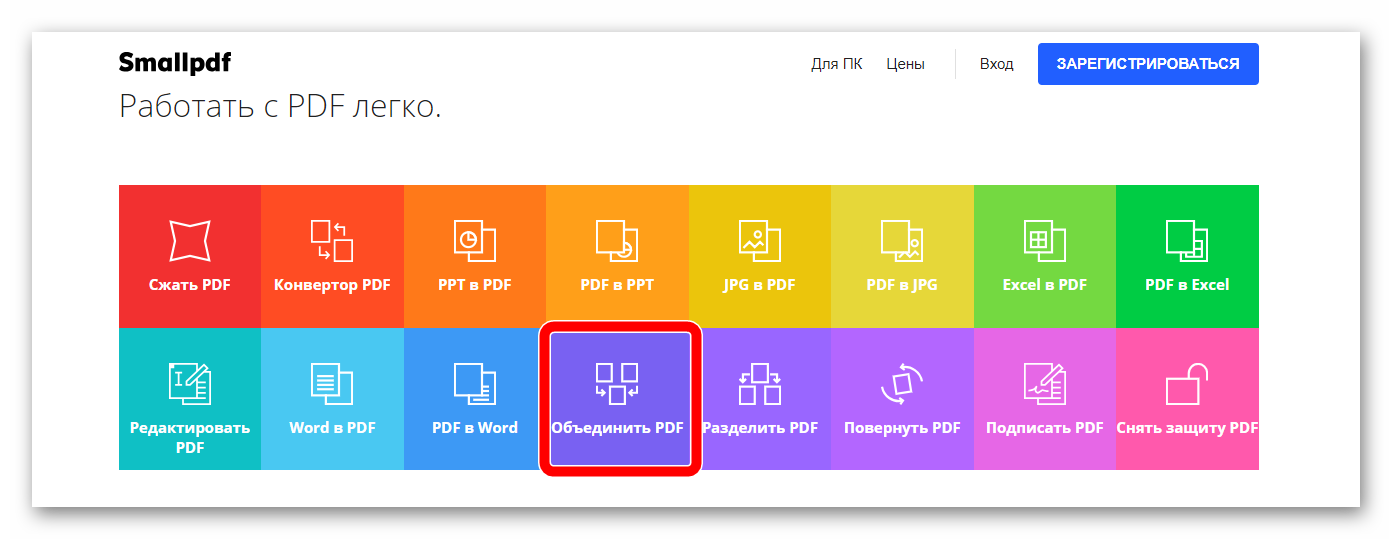 Теперь после выбора pdf, объедините их при помощи специальной кнопки