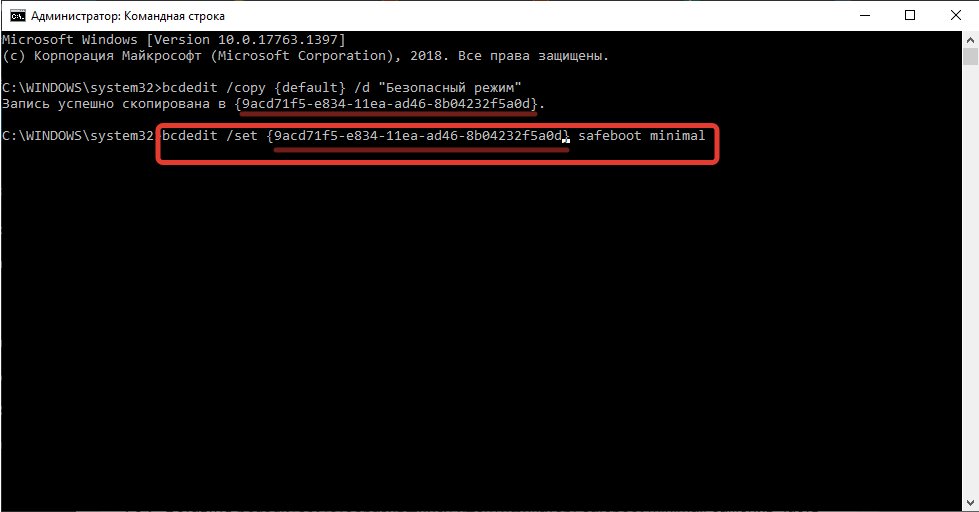 - Вставить bcdedit /set {отобразившийся идентификатор} safeboot minimal, заменив часть кода на ранее скопированный объект.