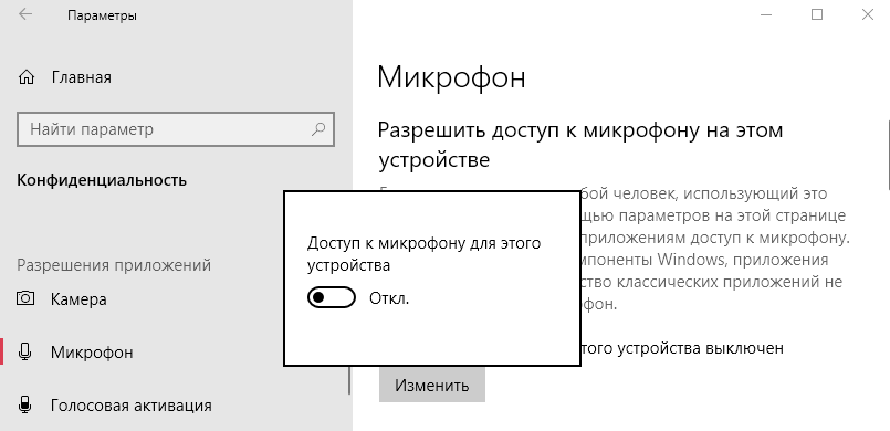 Если же в параметрах конфиденциальности доступ к микрофону разрешён, любой человек, использующий это устройств, может, с помощью параметров на этой странице разрешить или запретить приложениям доступ к микрофону.