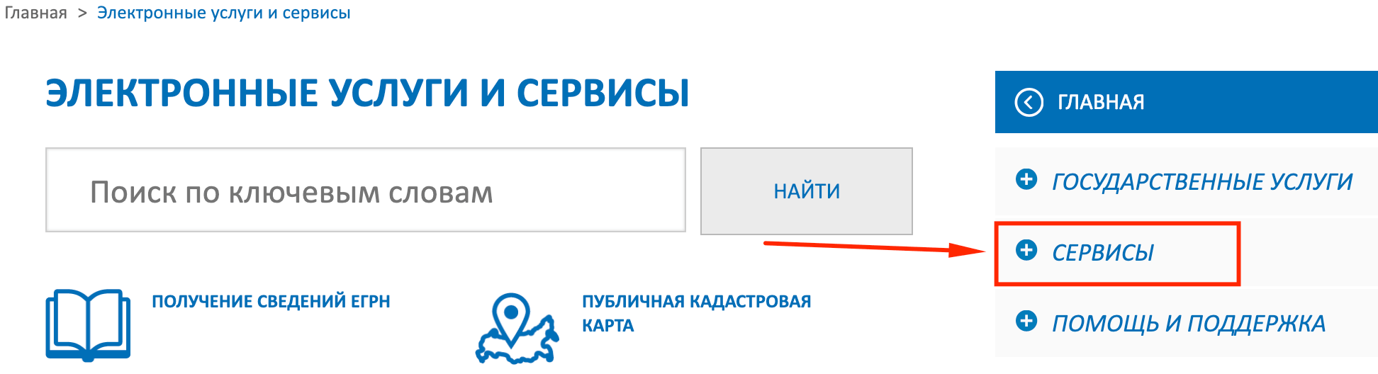 - Зайти на сайт https://rosreestr.ru/site/, пролистать вниз и нажать на ссылку Электронные услуги и сервисы.