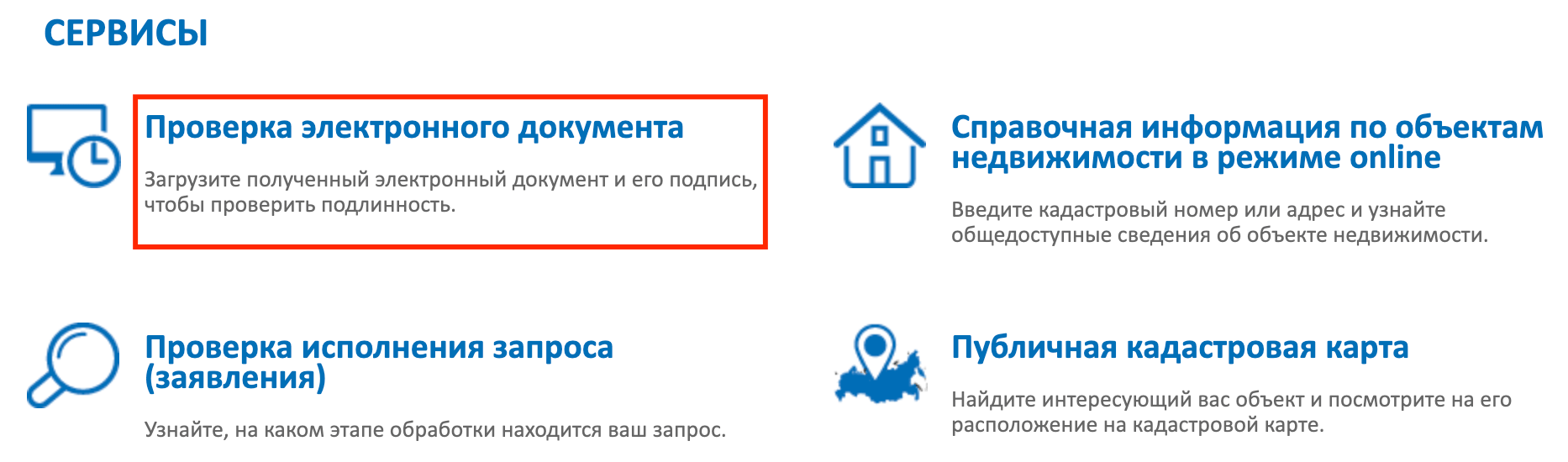 На сайте Росреестра есть сервис, позволяющий проверять электронные документы. Есть возможность проверить подпись на двух типах файлов: Цифровая подпись (sig-файлы) и Электронные документы (xml-файлы).