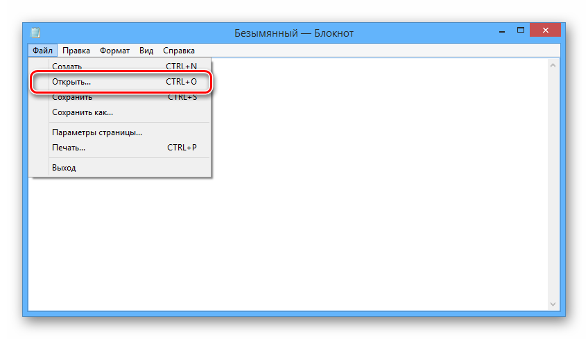 - Он откроется в Блокноте. Выбрать вкладку Файл.