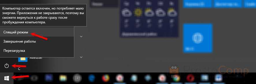 Нажмите на «Пуск», нажмите на символ включения и выберите пункт «Спящий режим»