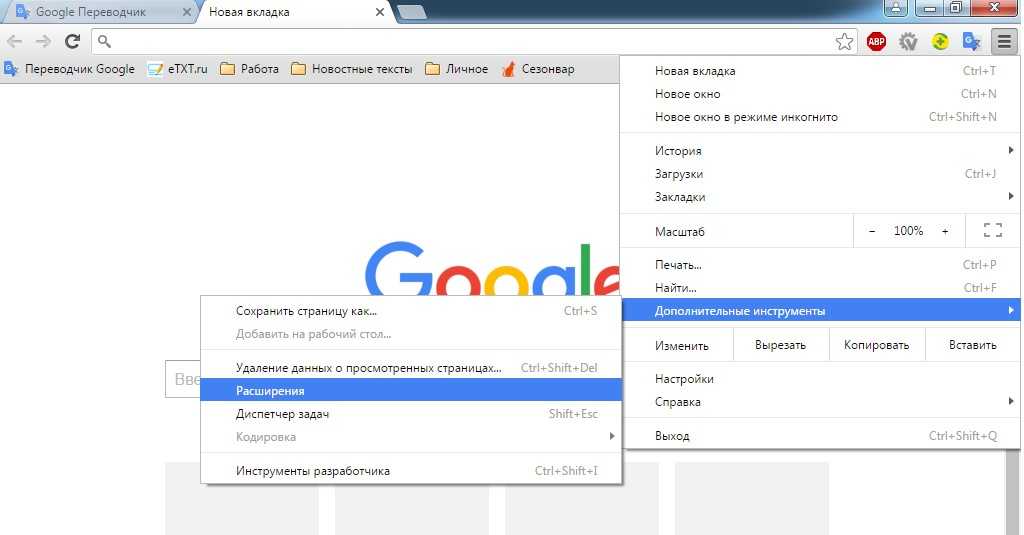 Вход в меню управления расширениями в Chrome.