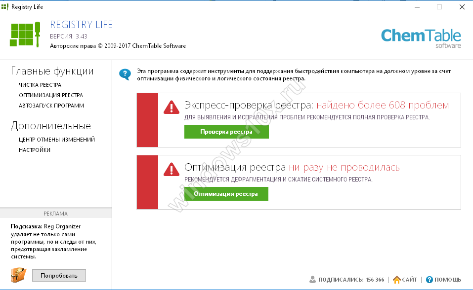 Registry Life – это бесплатная утилита от разработчиков Reg Organizer. В отличии от вышеописанной, она имеет только основные функции, которые помогут привести файлы реестра в порядок. Однако Ввиду отсутствия функции глубокого сканирования Registry Life может проводить только поверхностный анализ и исправление ошибок. И все же, несмотря на весьма ограниченный функционал, утилиты вполне хватит для того, чтобы исправить большую часть ошибок реестра.