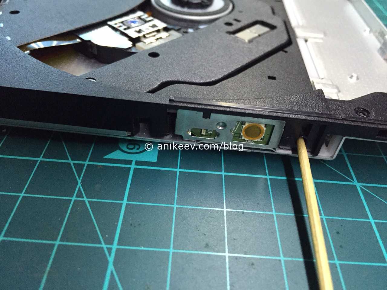 Плата, к которой нам нужно получить доступ, надёжно спрятана под лотком для диска. Но, как и в обычных больших приводах, лоток можно выдвинуть механически. Чтобы это сделать на ноутбучном приводе без морды, нужно ткнуться зубочисткой в отверстие чуть правее от кнопки выброса. Если декоративная морда на приводе есть, то на ней же есть отверстие, куда нужно тыкаться. Хотя оно, вероятно, будет немного уже, поэтому вместо зубочистки придётся взять разогнутую тонкую скрепку.