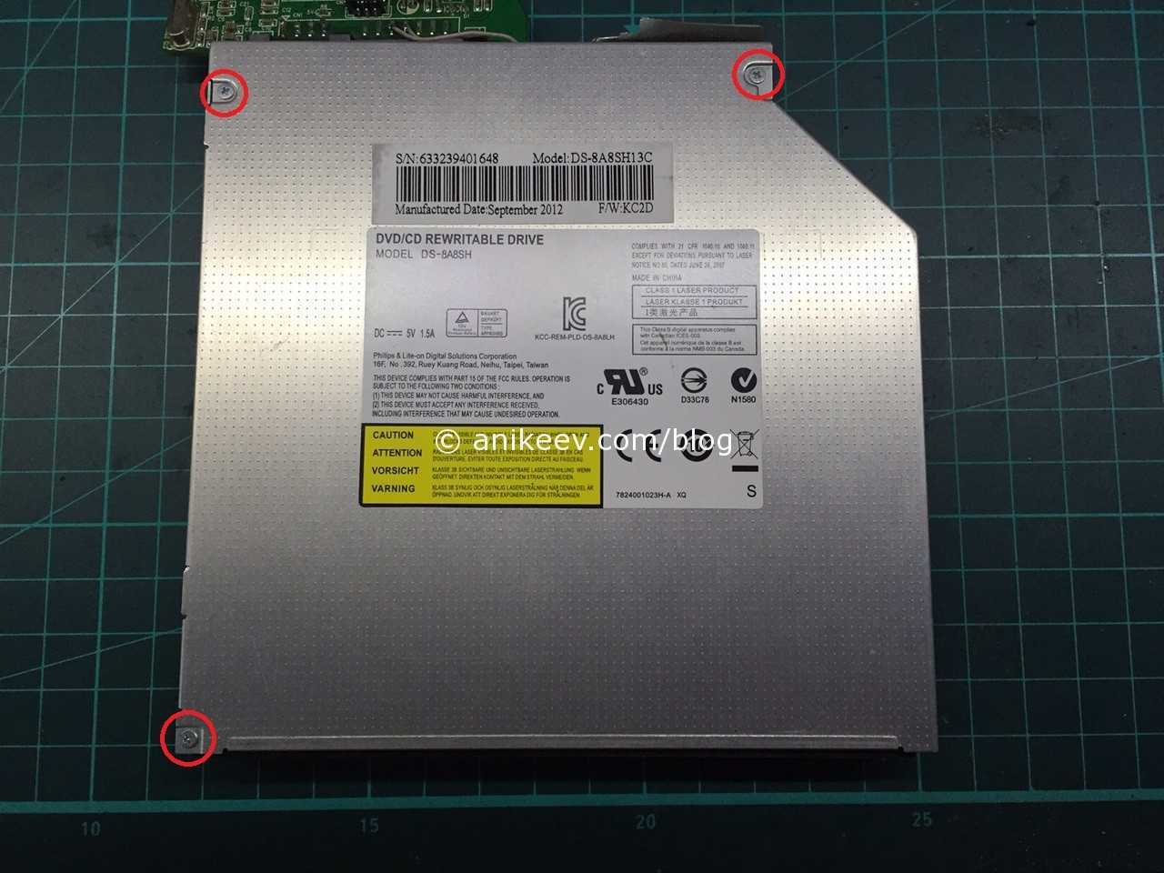При этом, важно установить девайс правильно – чтобы диск не выпадал при закрытии лотка. На шасси, девайс фиксируется крепежными винтами
