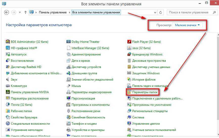 Открываем «Пуск» —> «Панель управления». В меню «Просмотр» выбираем пункт «Мелкие значки». Дальше находим и щелкаем по «Параметры папок»:
