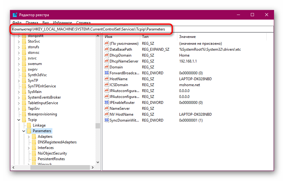 откроется окно Редактора файлового реестра, в правой части которого необходимо последовательно перейти по папкам: «Hkey_Local_Machine», «System», «CurrentControlSet», «Services», «Tcpip», «Parameters»