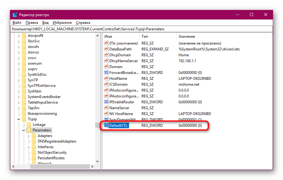 Изменение значения TTL в реестре Windows