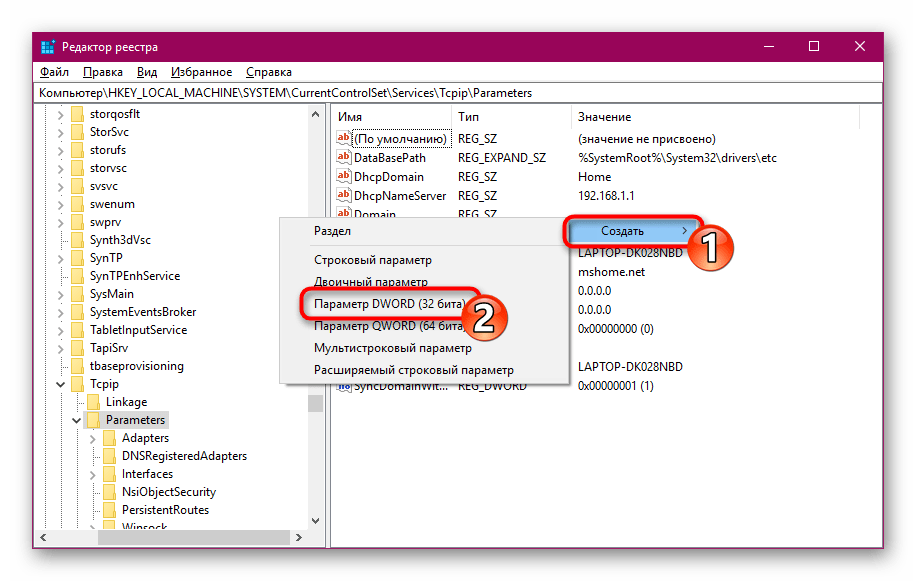 В этой ветке можно редактировать параметры передаваемого пакета данных. Здесь нам необходимо создать новый параметр и ввести его имя « DefaultTTL ». Для этого нажмите ПКМ (правую кнопку мыши) на левом блоке и выберите «Создать», правее нажмите « Параметр DWORD32 ».