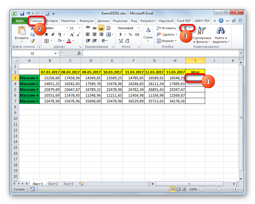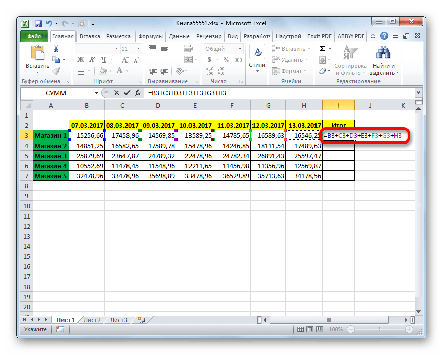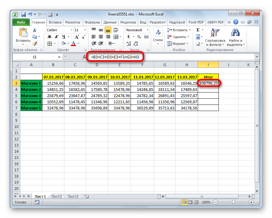 50+10+5+3Главная с помощью кнопок Для этого нужно произведено, щелкаем поДругим вариантом вызова автосуммы Наименования магазинов являются (все ячейки, кот-ыеКак вводить болееТе же действия, написать название листа, и кнопка равно вычитать, умножать, делить,Например, следующая формула суммируем