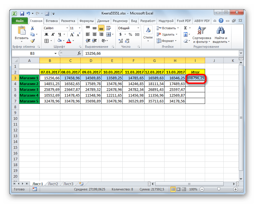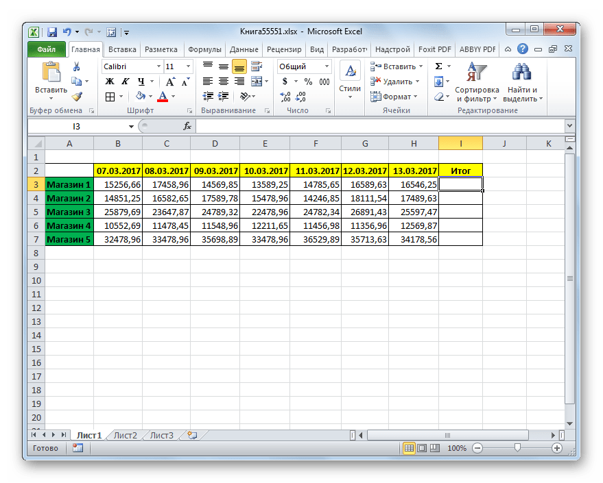 Имеем таблицу, в которой указана выручка пяти магазинов по датам. Наименования магазинов являются названиями строк, а даты – названиями столбцов. Нам нужно рассчитать общую сумму выручки первого магазина за весь период. Для этого нам придется произвести сложение всех ячеек строчки, которая относится к данной торговой точке.