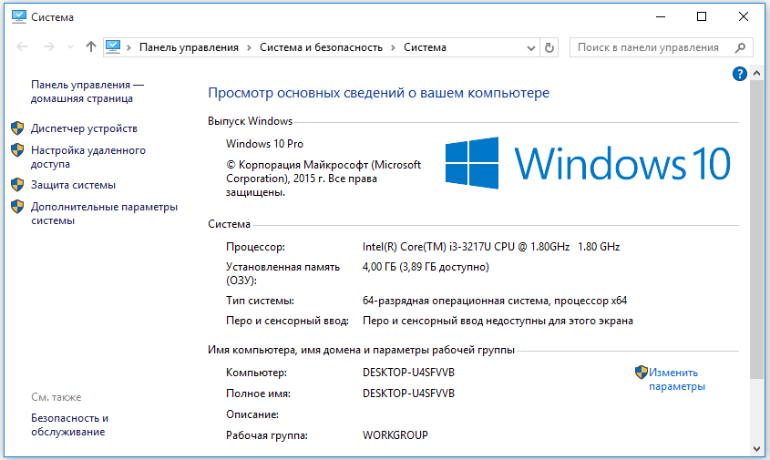 Нажмите одновременно клавиши WIN + PAUSE/BREAK. Здесь вы увидите минимальные данные о системе: процессор, оперативная память и разрядность ОС.